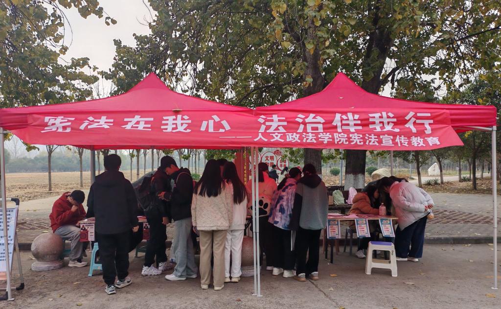 为弘扬宪法精神,12月4日,人文政法学院天平社在南区三棵树开展了以“宪法伴我心,法治伴我行”为主题的宪法宣传教育活动。